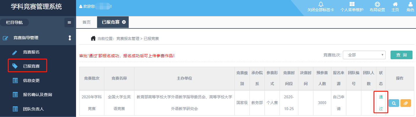 已报名2021年全国大学生英语竞赛(B类、C类)的学生可登录学科竞赛管理系统http://xkjs.cnpigeon.com/“已报竞赛”模块查看报名结果,状态为“通过”表示报名成功。