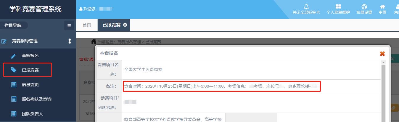 ② 登录学科竞赛管理系统通过“已报竞赛”模块备注处查看考场信息。