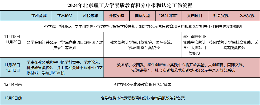 根据学校相关工作安排,2024-2025学年第一学期素质教育积分申报和认定工作将于第14周-16周进行。现将相关事项通知如下: