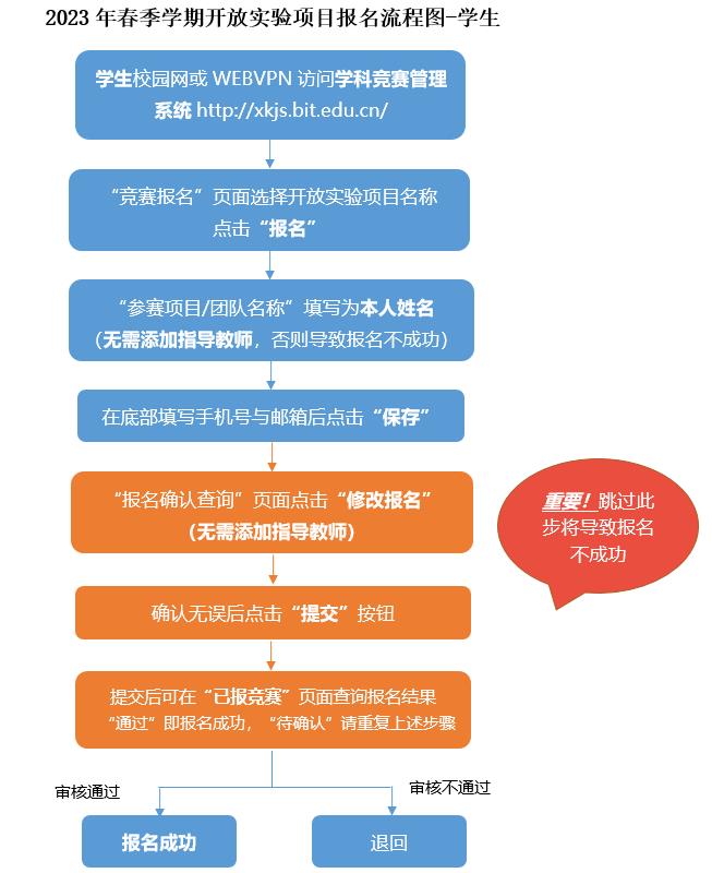请学生选题前仔细查看下方报名流程图,并阅读《开放实验项目学生操作手册》(附件3),操作中缺少重要步骤将会导致报名不成功。