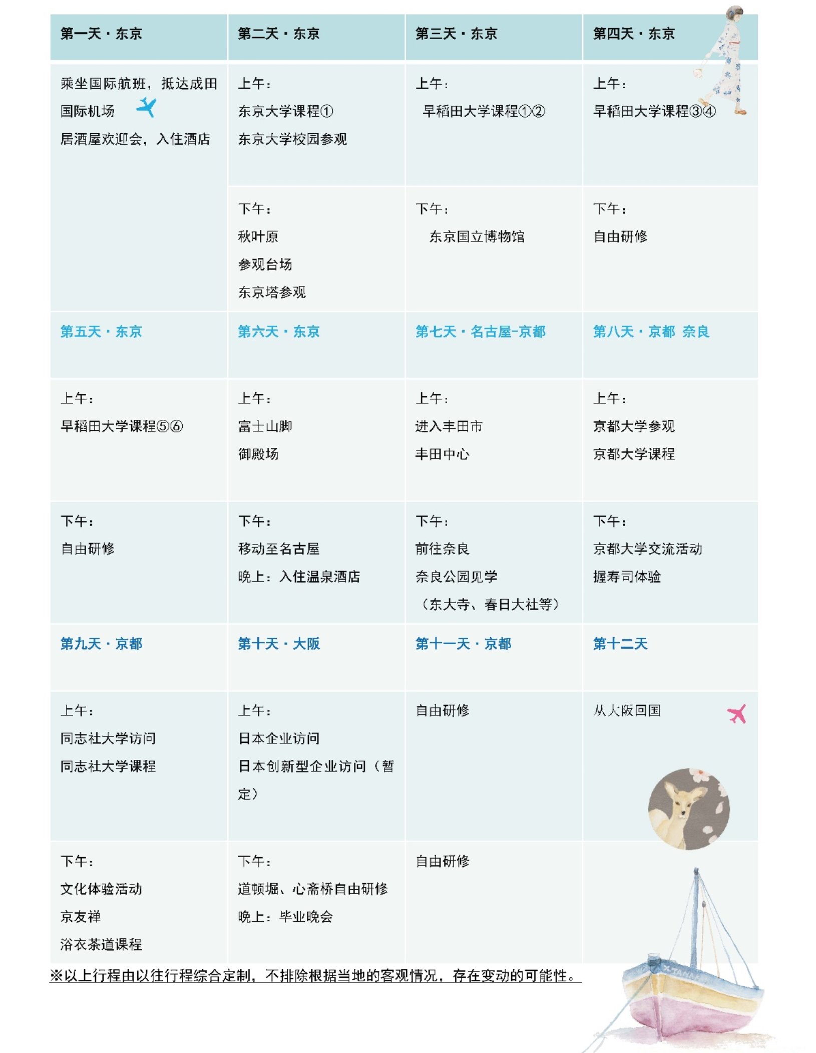 项目费用包含:项目报名费、大学学费、签证邀请函制作费及国际邮寄费、海外意外保险费、全程住宿费、日本机场接送费、大巴费用、欢迎会&欢送会餐费、集体活动时的门票及各项费用;