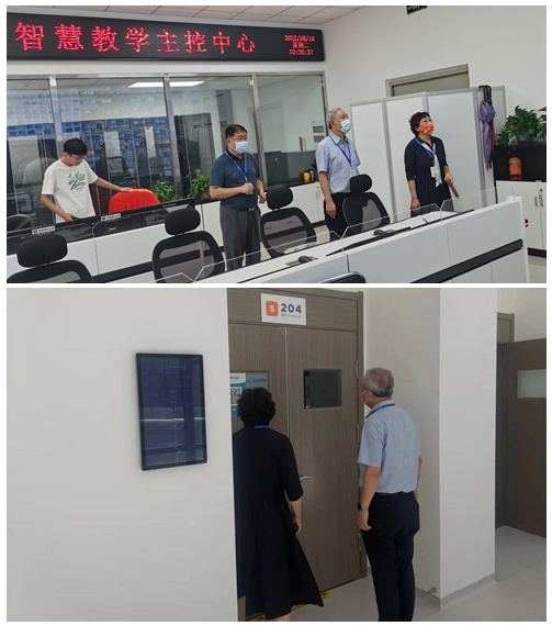 在智慧教学主控中心,王晓锋对良乡校区智慧教室的远程控制及实时授课情况进行了全面的检查和指导,并实地走访了正在上课的教室,对教学情况和教室设施的使用情况开展了巡视检查。他提到,在疫情防控常态化要求下,要切实保证师生线上课程的平稳运行,优化师生线上课堂环境。